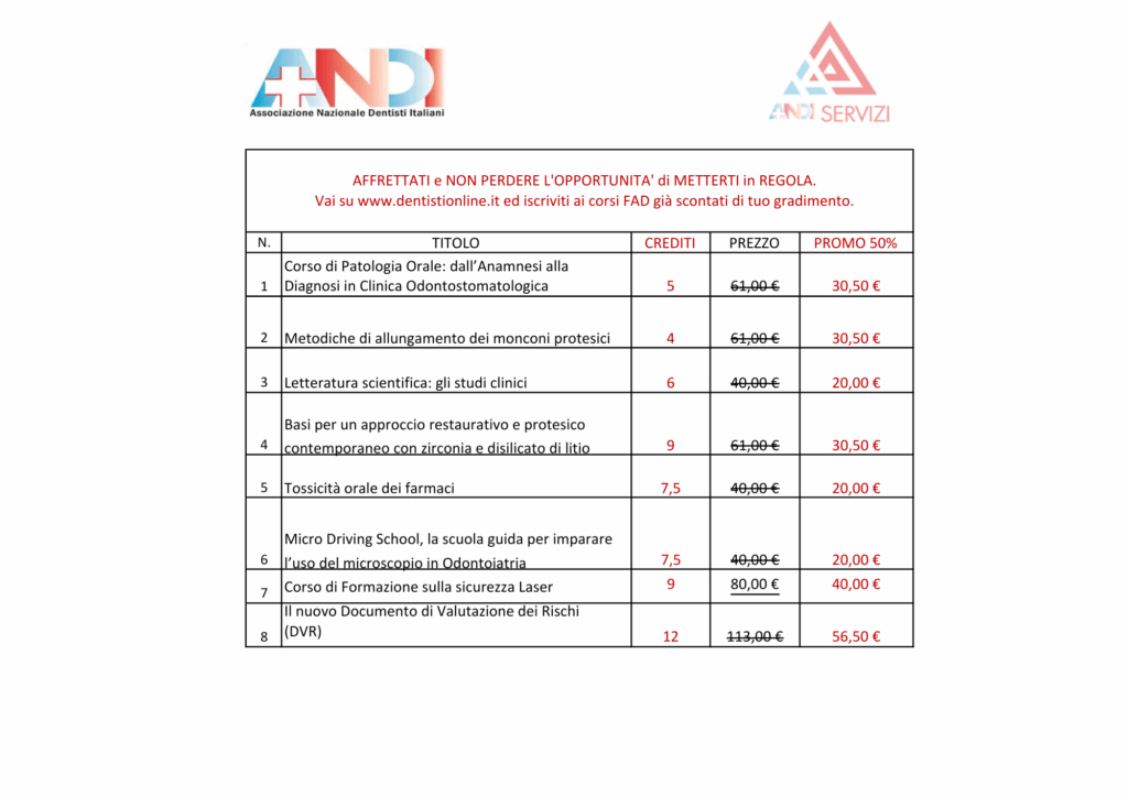 Al fine di agevolare tali adempimenti, ANDI Servizi mette a disposizione alcuni corsi FAD con una riduzione dei costi pari al 50%.