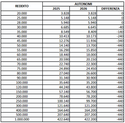 Il taglio dell’aliquota riguarderà circa 13,6 milioni di contribuenti e assorbirà risorse finanziarie per circa 3 miliardi di euro all’anno. In particolare, coloro che dichiarano redditi superiori a 28mila euro potranno beneficiare di un taglio delle imposte fino a un massimo di 440 euro l’anno, come si evince dalla seguente tabella, che riporta il calcolo dell’Irpef su redditi di lavoro autonomo mettendo a confronto il regime attuale (2025) con aliquota del secondo scaglione al 35% e il nuovo modello, operativo dal 2026, con aliquota del 33%.