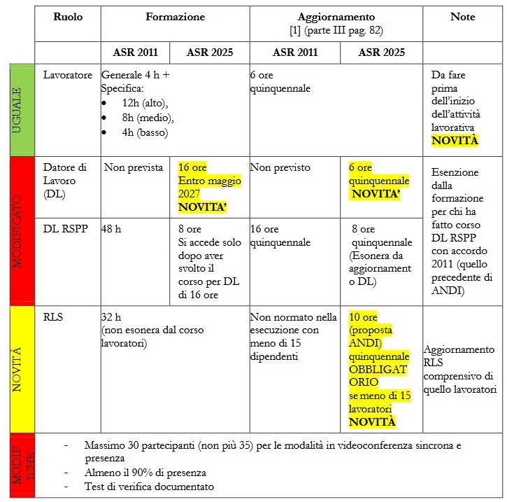 La durata della formazione per RLS rimane di 32 ore mentre l’aggiornamento, per le aziende con meno di 15 dipendenti, è obbligatorio (vedi pareri legali acquisiti da ANDI), ma le modalità esecutive sono rimesse alla contrattazione collettiva nel rispetto dei criteri di proporzionalità.